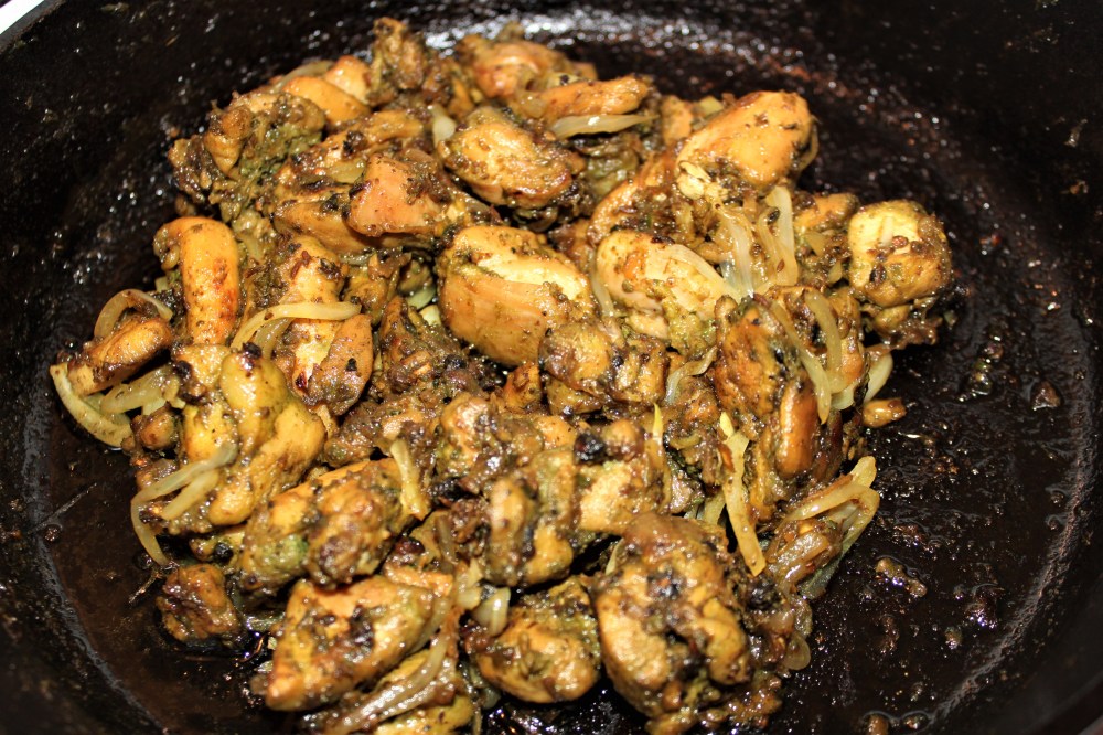 This south Indian spicy and dry side dish is made by marinating chicken thighs in crushed black pepper, cilantro and green chilly and roasted along with caramelized onions. It is a quick and easy recipe. Cilantro and black pepper combination is also a proven fast remedy for common cold.