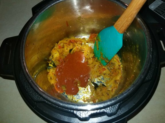 - Add the spice paste to the onion masala and stir well for a minute and add the tamarind piece along with few tbsp water so that nothing burns or sticks to the bottom of the inner pot.
