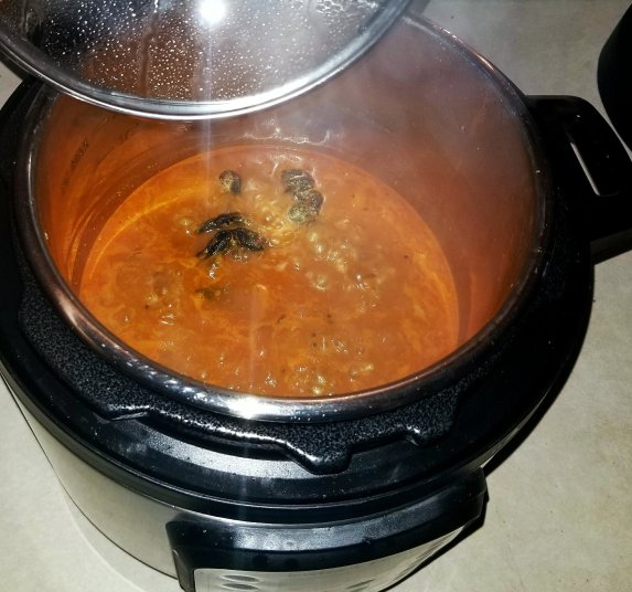 - Once oil starts separating from the masala,add 2 cups water and tamarind pieces and close the IP with a glass lid.Let the curry continue simmering for 2 minutes on sauté mode.