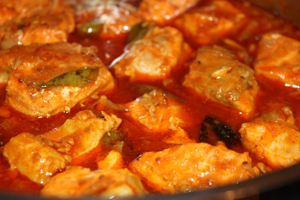 Spicy and delicious South Indian curry. Fresh Salmon steak cooked in a spiced shallot, tomato and tamarind based gravy.