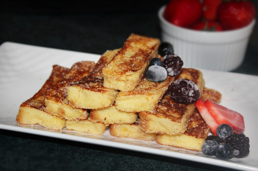 - Stack the cinnamon coated toast sticks on a plate, dusted with powdered sugar and serve warm along with fresh berries or a drizzle of maple syrup.